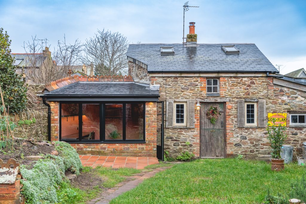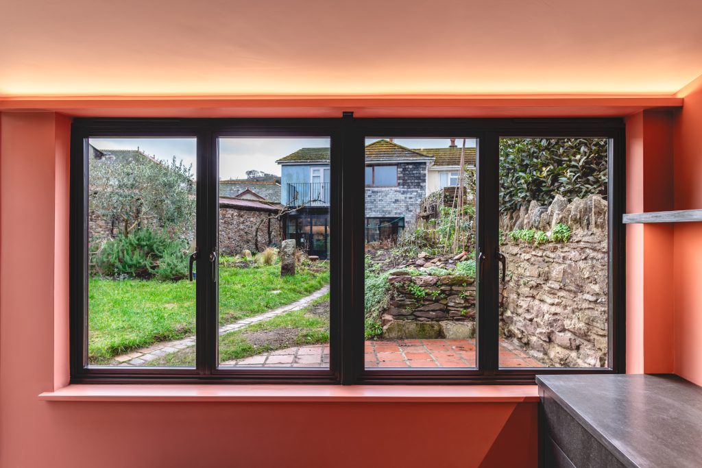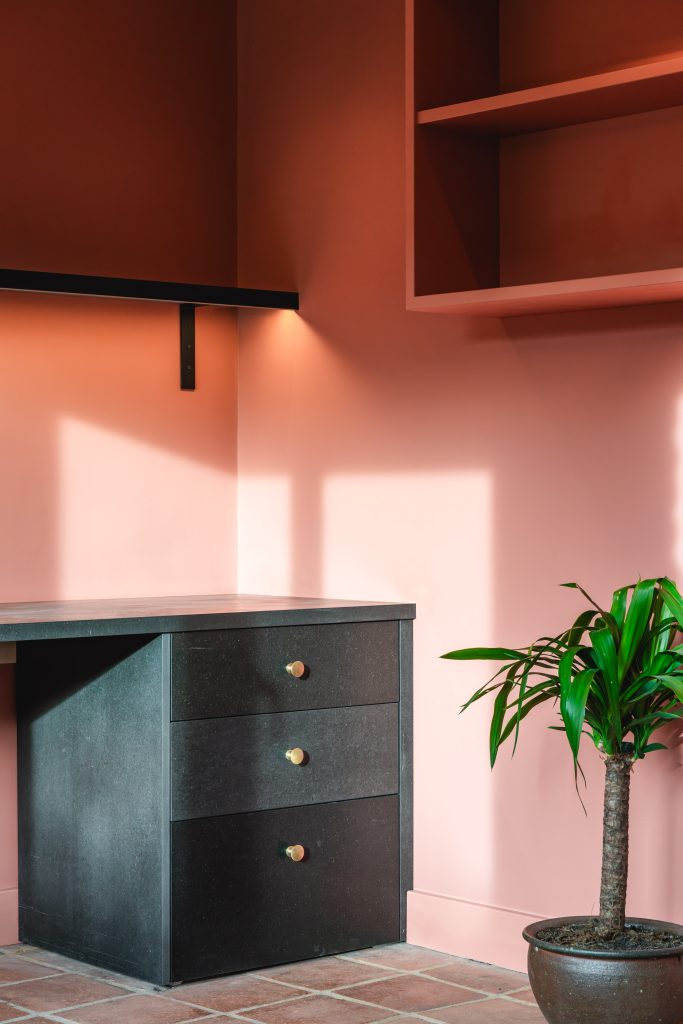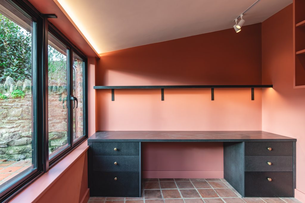 We transformed a tired brick outbuilding into a beautiful contemporary office. Valchromat desk and drawer fronts on birch ply cabinetry compliment the smart new aluminium door and window. Natural slate roof tied into the existing annexe. Perfect for doing accounts or penning a magnum opus.