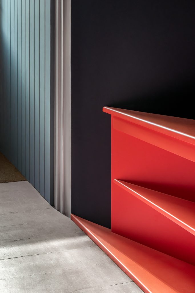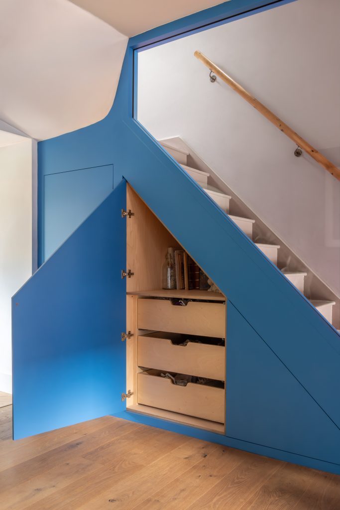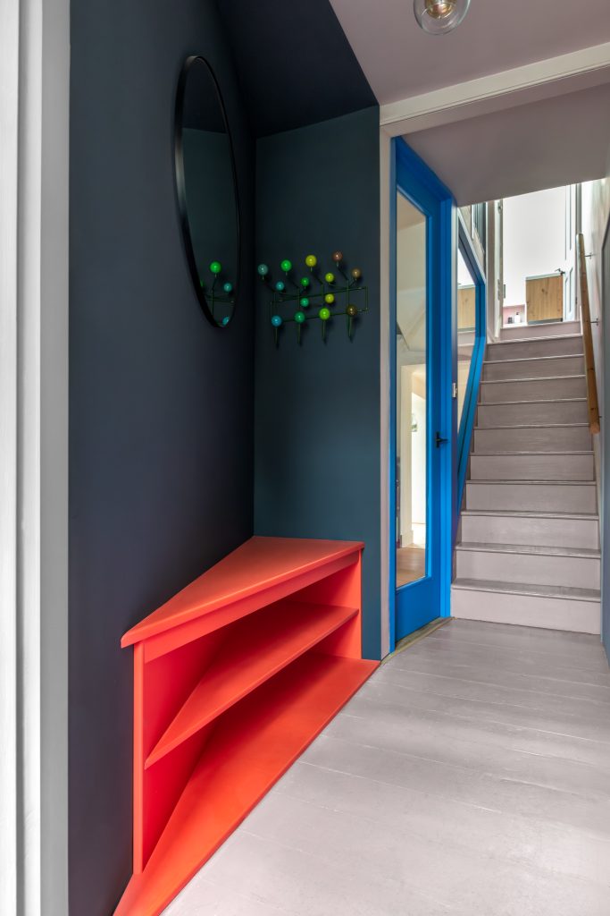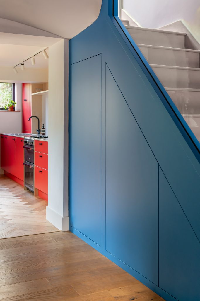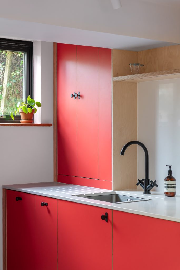 Clara and David wanted some bold colours for their new kitchen and storage. It came out fantastic. Formica face birch ply kitchen.